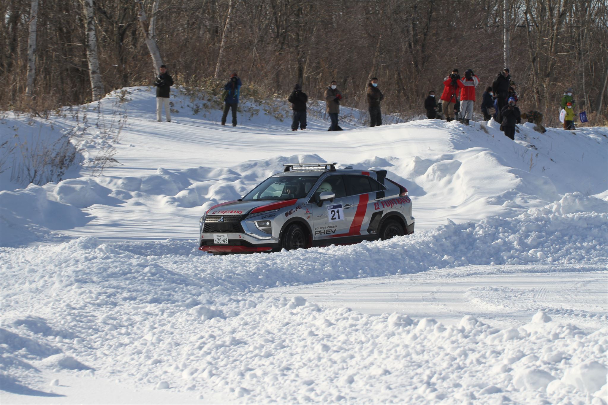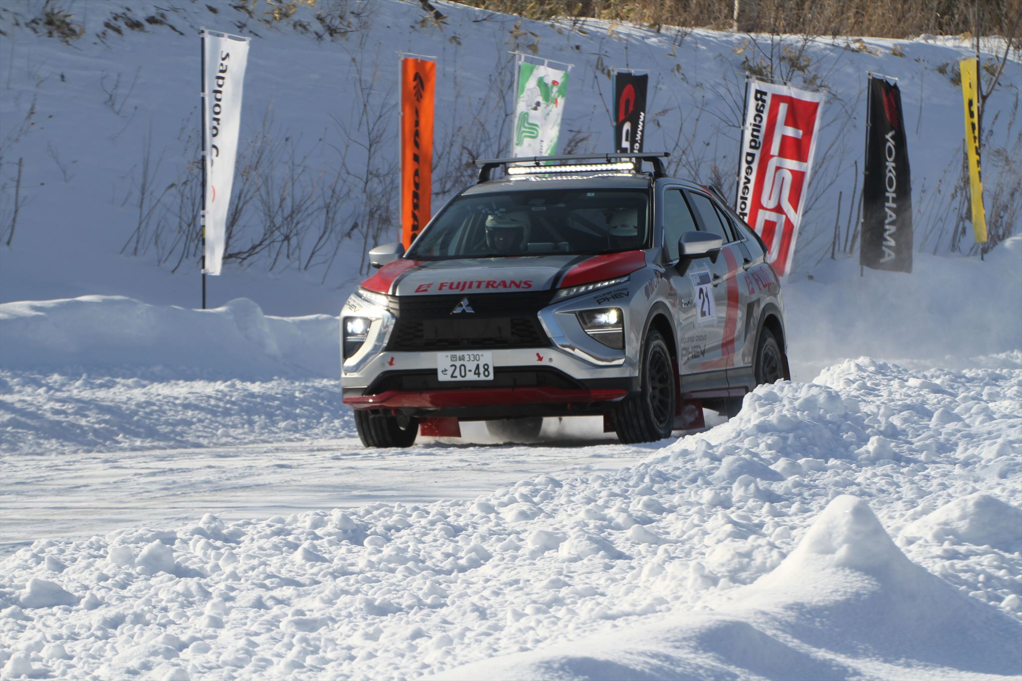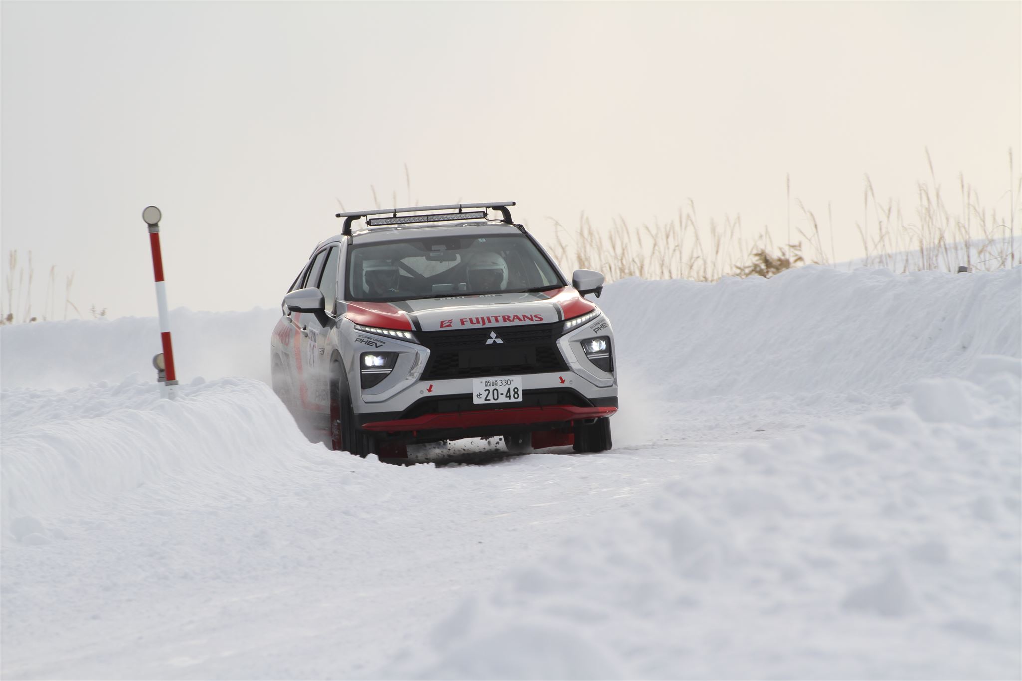 エクリプスクロスの揚村/笠井組は新千歳内の氷板路のような路面では車両の重量もあってかタイムが伸びなかったが、ハイスピードコースとなったSS5では約5秒、SS6では約10秒も追い上げるタイムを出した!